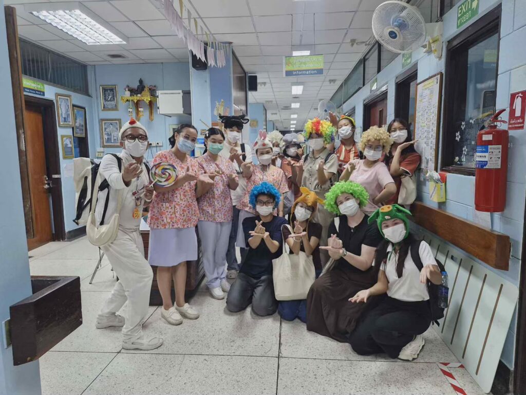 Our second volunteering event was visiting the children at Srinagarind Hospital. It was a little challenging at first because we have to be cleared to be able to be in the same room as the children since some are receiving treatments or some are sick. When we were given the green light, we split into 2 groups and entertained the children. Some activities we did were singing, dancing, making bracelets, and decorating bookmarks!