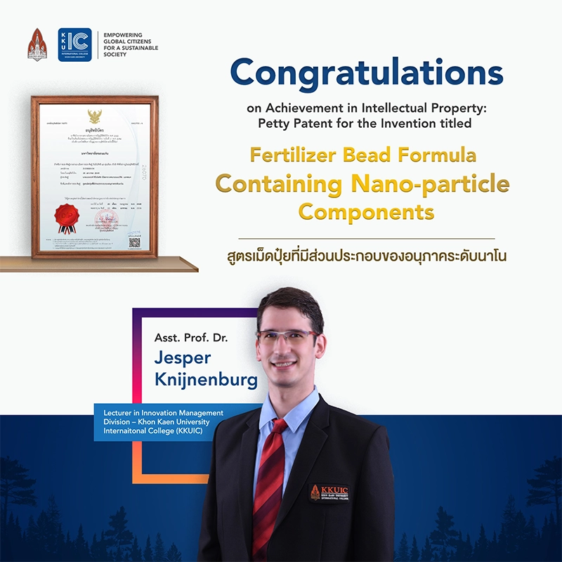 Congratulations to Asst. Prof. Jesper Knijnenburg, Ph.D., Lecturer in Innovation Management Division – KKUIC, and his team on achievement in intellectual property: “Petty Patent” for the invention titled “Fertilizer Bead Formula Containing Nano-particle Components (สูตรเม็ดปุ๋ยที่มีส่วนประกอบของอนุภาคระดับนาโน)”