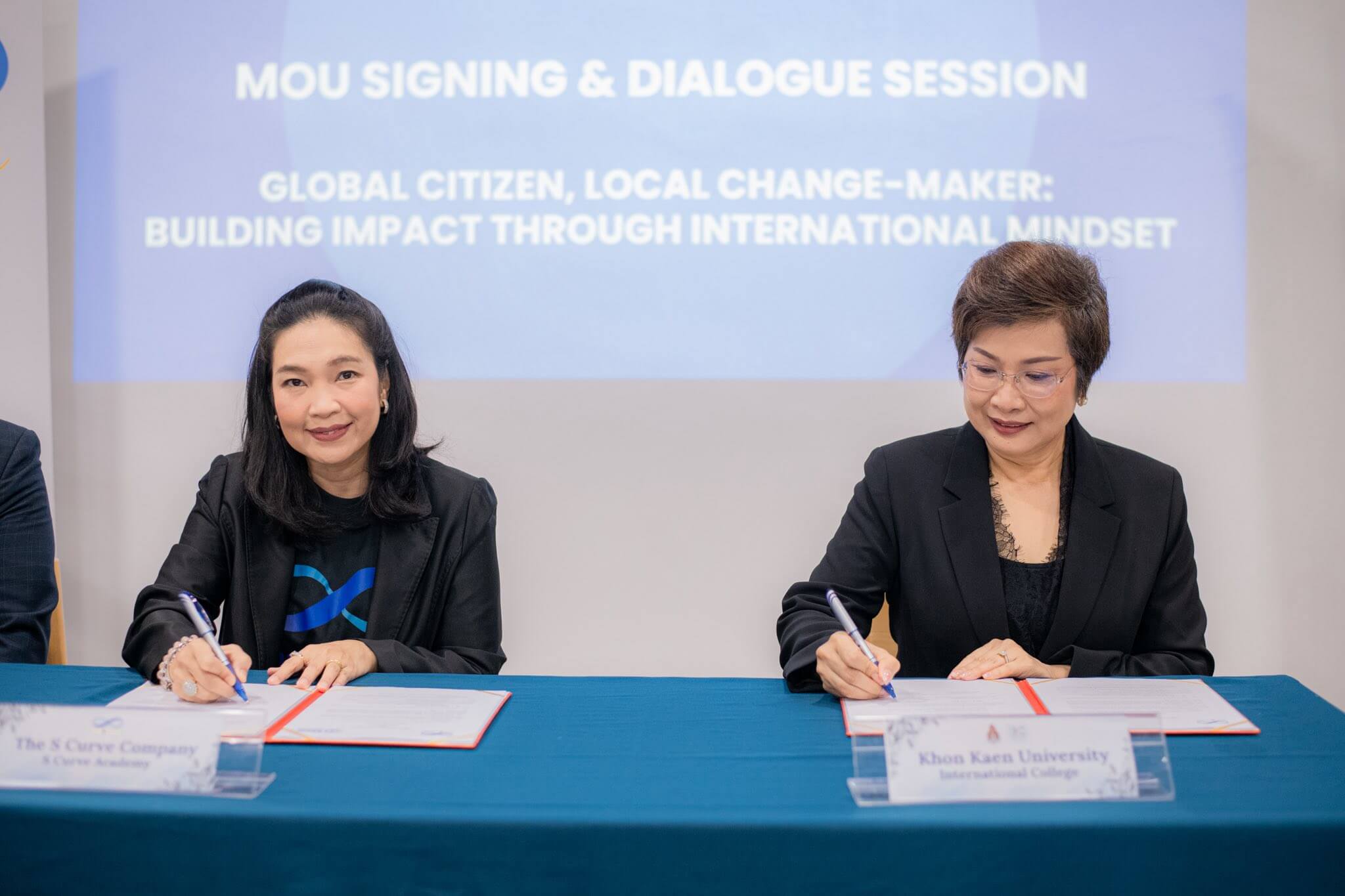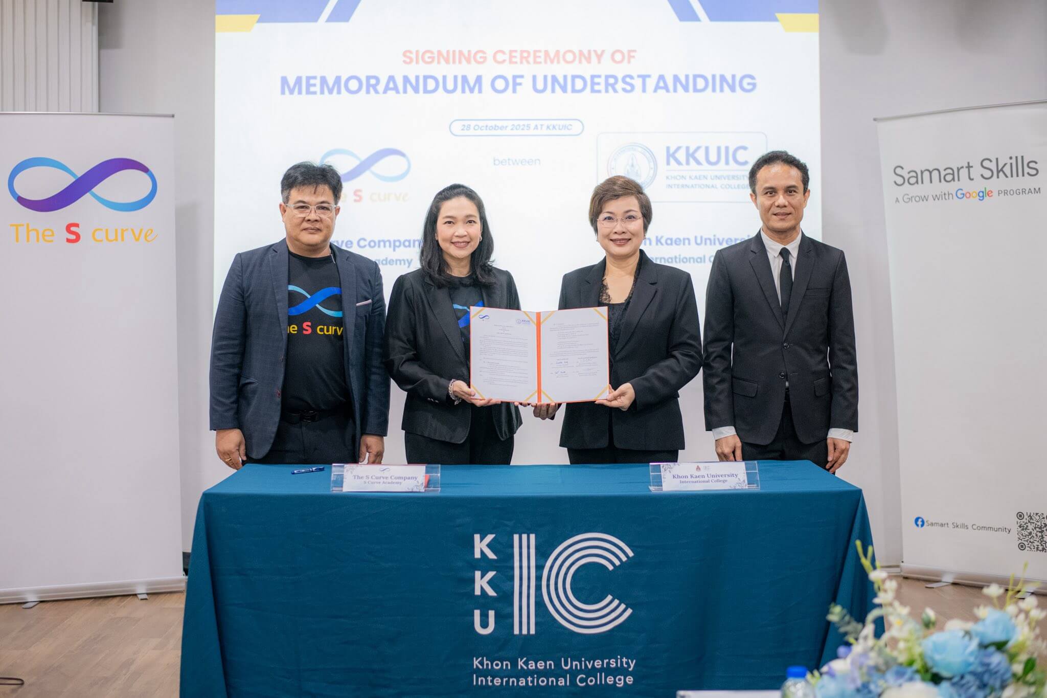 On October 28, 2025, Khon Kaen University, led by Asst. Prof. Denpong Soodphakdee, Vice President for Education and Digital, Khon Kaen University, and Khon Kaen University International College, led by Asst. Prof. Sirimonbhorn Thipsingh, Dean, KKUIC along with Asst. Prof. Khwanjira Ponsree, Associate Dean for Marketing Communication and Student Empowerment, organized a signing ceremony for a Memorandum of Understanding (MoU) with S Curve Company Limited to strengthen collaboration in knowledge development and personnel capacity building.