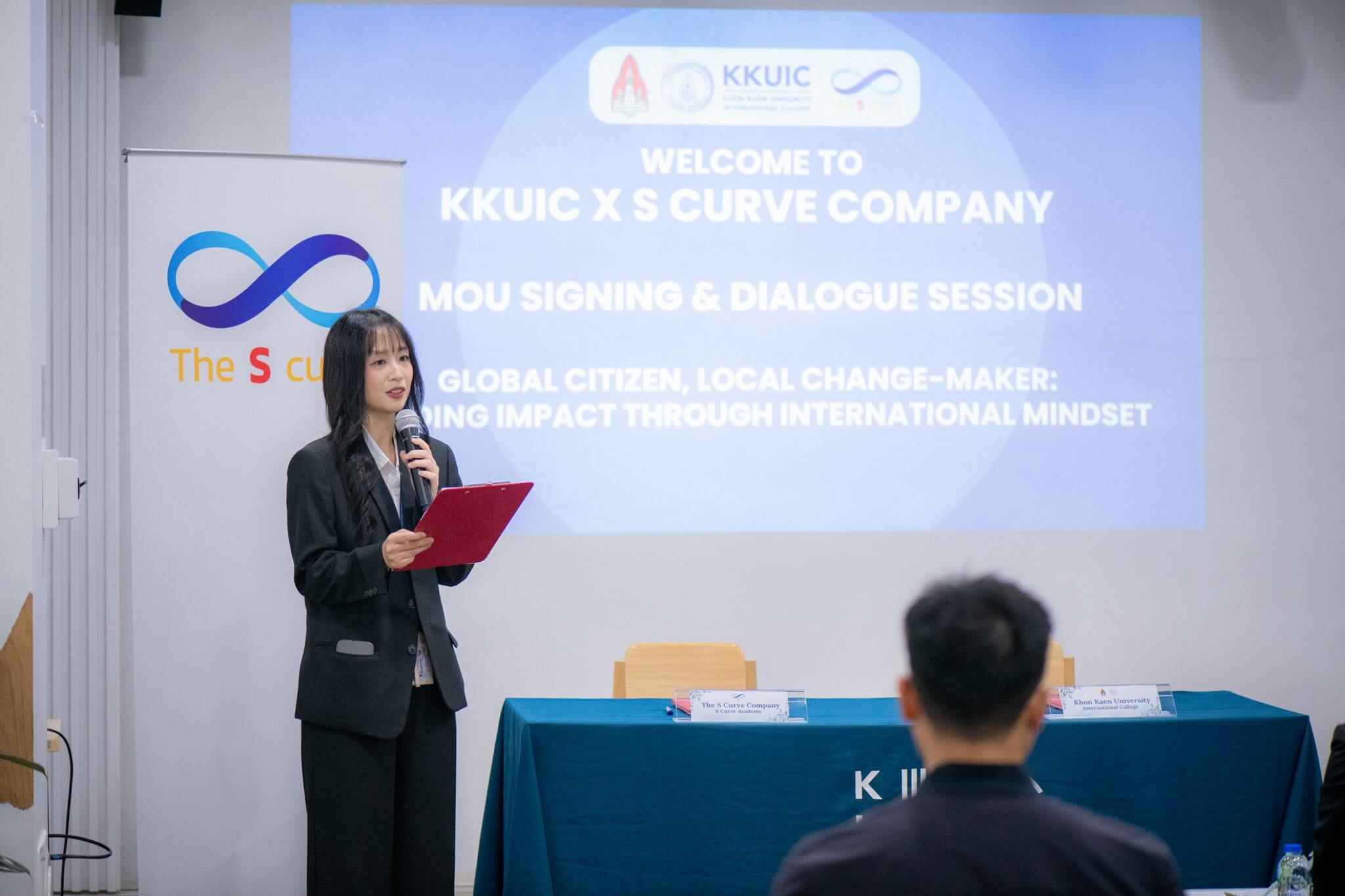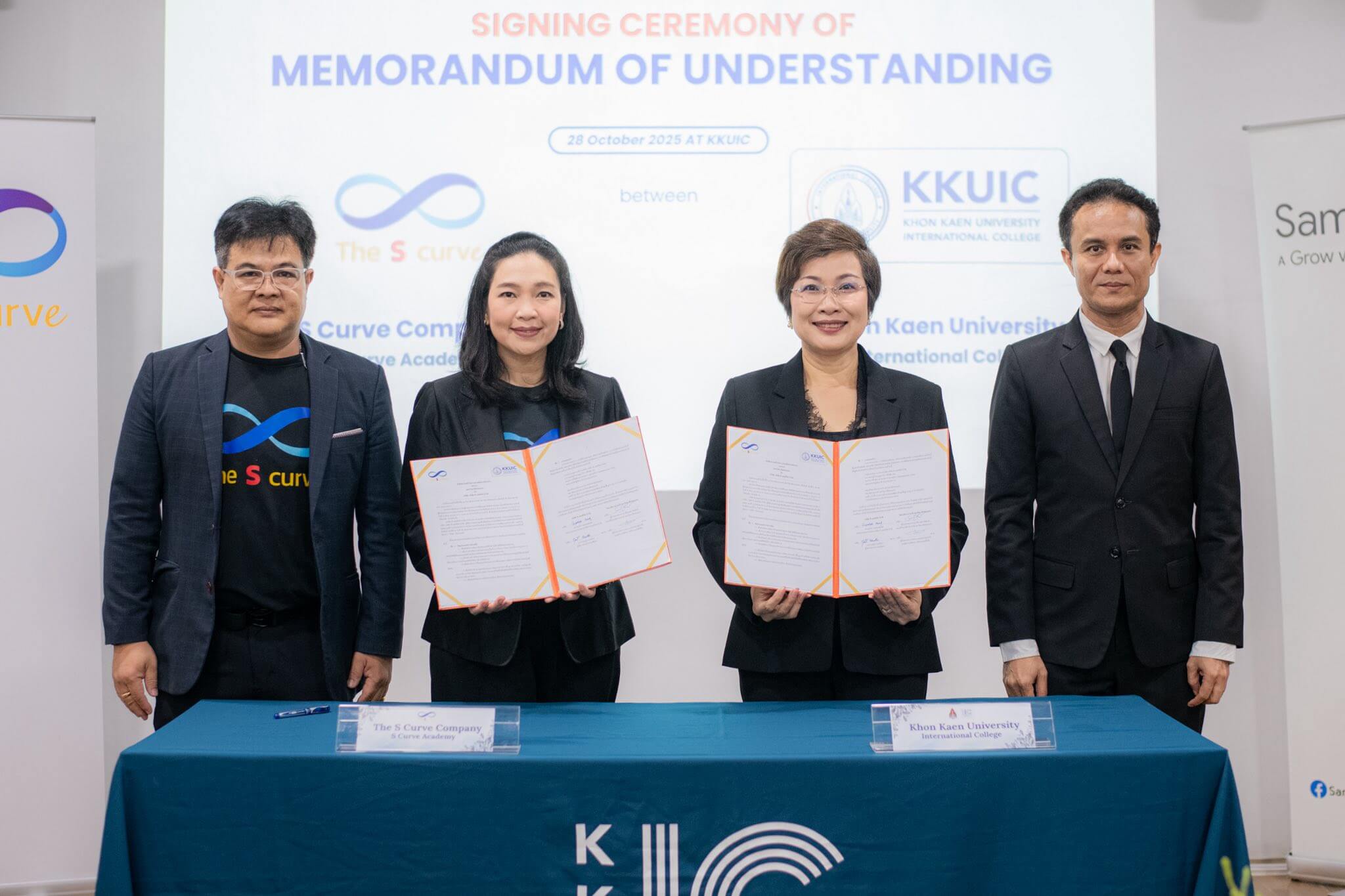 On October 28, 2025, Khon Kaen University, led by Asst. Prof. Denpong Soodphakdee, Vice President for Education and Digital, Khon Kaen University, and Khon Kaen University International College, led by Asst. Prof. Sirimonbhorn Thipsingh, Dean, KKUIC along with Asst. Prof. Khwanjira Ponsree, Associate Dean for Marketing Communication and Student Empowerment, organized a signing ceremony for a Memorandum of Understanding (MoU) with S Curve Company Limited to strengthen collaboration in knowledge development and personnel capacity building.