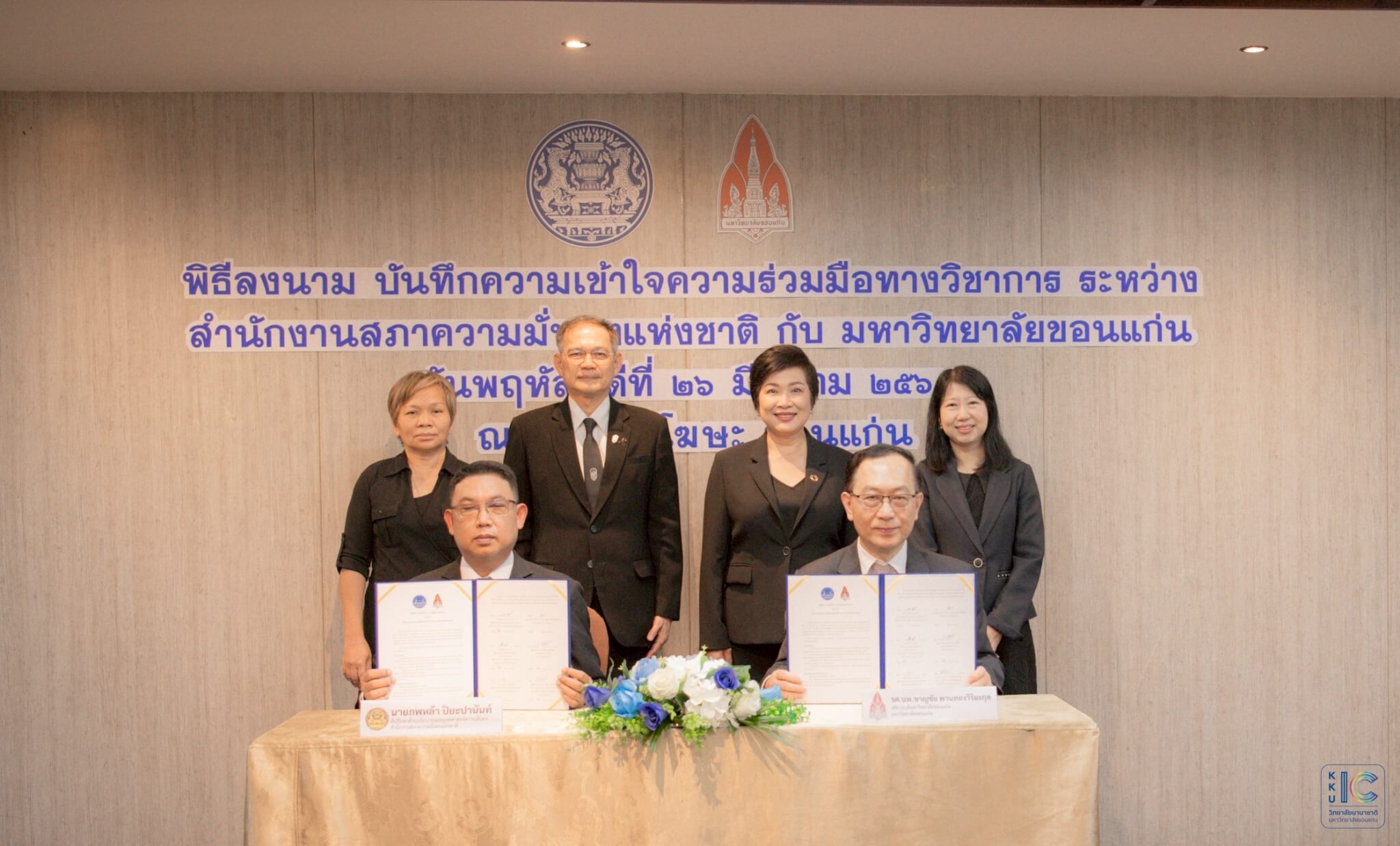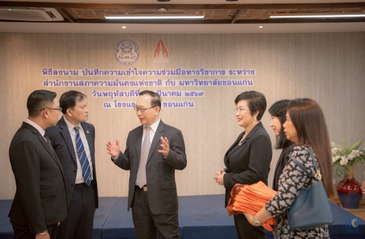 เมื่อวันที่ 26 มีนาคม 2569 วิทยาลัยนานาชาติ มหาวิทยาลัยขอนแก่น นำโดย ผู้ช่วยศาสตราจารย์ สิริมนพร ทิพสิงห์ คณบดี พร้อมด้วย อาจารย์ ดร.ณธกร เลิศพชรกมล รองคณบดีฝ่ายการศึกษา ส่งเสริมศักยภาพนักศึกษาและบริหารความสัมพันธ์ และ อาจารย์จิตติมา ไกรศรีวรรธนะ ผู้ช่วยคณบดีฝ่ายหลักสูตรสร้างสรรค์และกิจการพิเศษ เข้าร่วมพิธีลงนามบันทึกความเข้าใจความร่วมมือทางวิชาการ (MOU) ระหว่างสำนักงานสภาความมั่นคงแห่งชาติ (สมช.) และมหาวิทยาลัยขอนแก่น ณ โรงแรมโฆษะ จังหวัดขอนแก่น เพื่อร่วมขับเคลื่อนองค์ความรู้ด้านความมั่นคง และพัฒนาศักยภาพบุคลากรและนักศึกษาให้เท่าทันต่อสถานการณ์โลก โดยเฉพาะประเด็นที่เชื่อมโยงหลากหลายมิติ ทั้งสังคม เศรษฐกิจ สิ่งแวดล้อม และความสัมพันธ์ระหว่างประเทศ และสนับสนุนการพัฒนานโยบายเพื่อความมั่นคงอย่างยั่งยืนของประเทศ